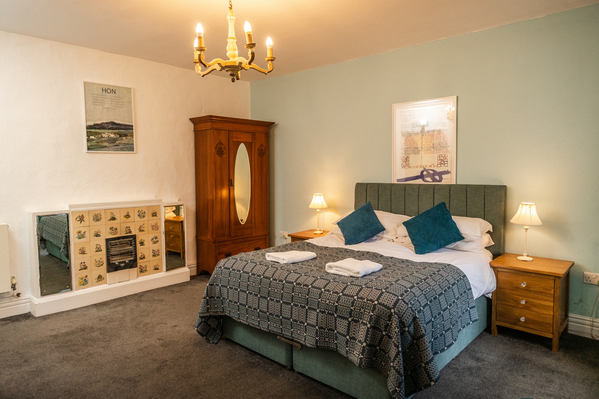 Ystafell fawr, gwely maint dwbl, gydag ystafell ymolchi en-suite (yn y prif dŷ)