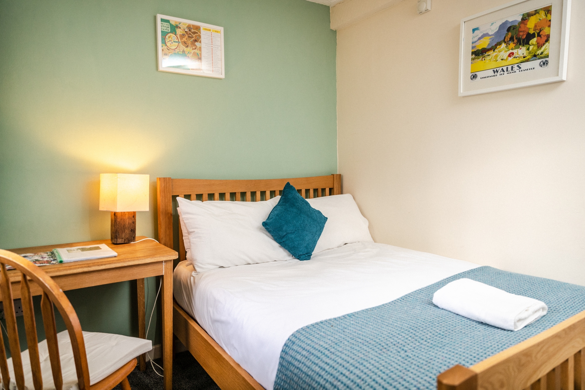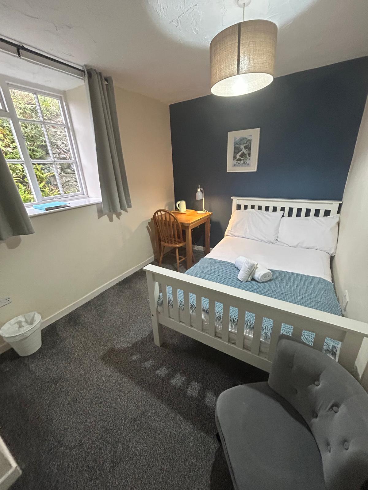 Ystafell fach, gwely maint dwbl, gydag ystafell ymolchi i’w rannu (yn Hafoty, ein adeilad allanol)
