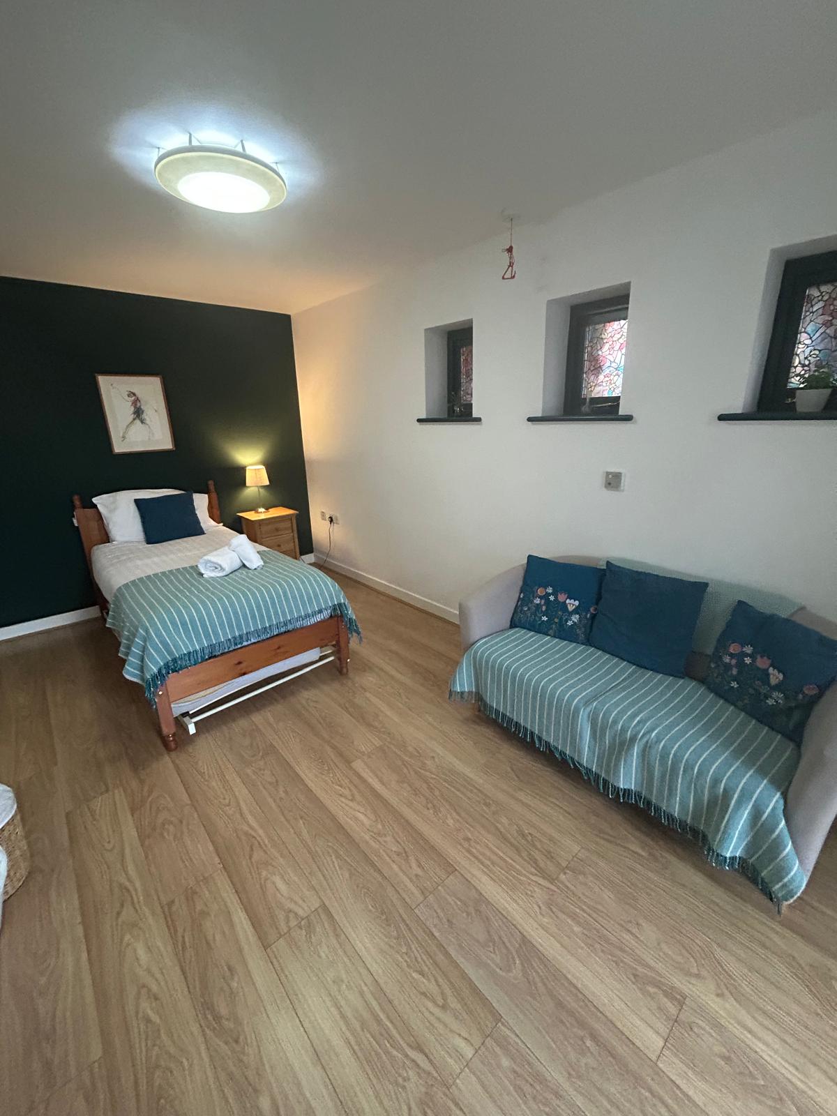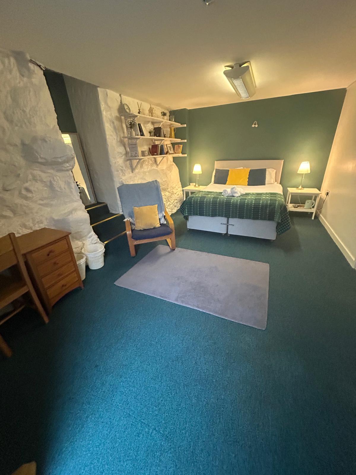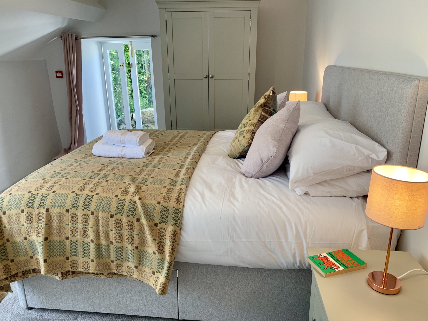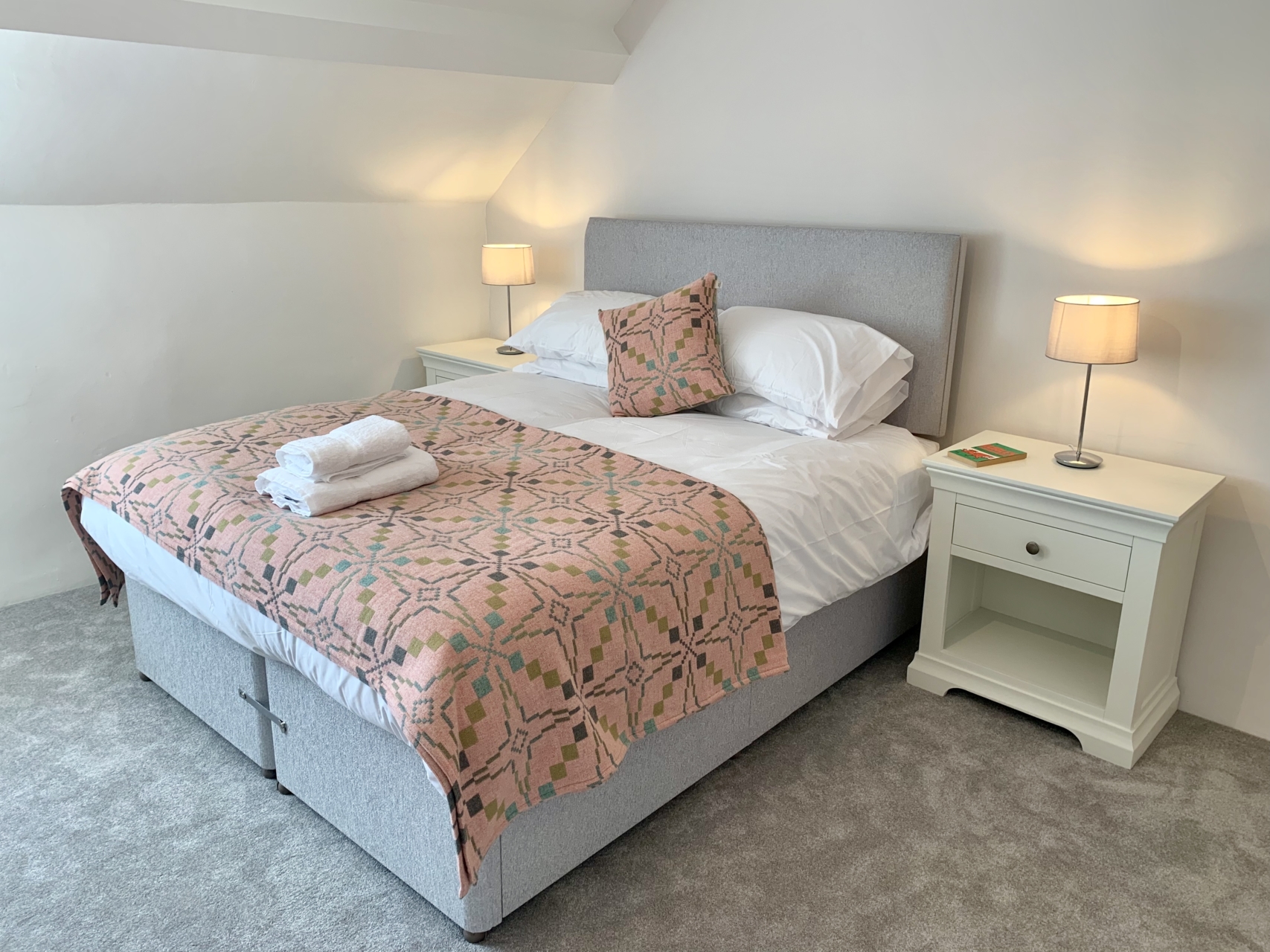 Ystafell ganolig ei maint, gwely maint brenin, gydag ystafell ymolchi i’w rannu (yn Hafoty, ein adeilad allanol)